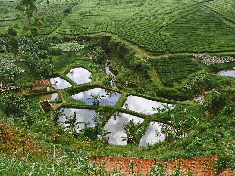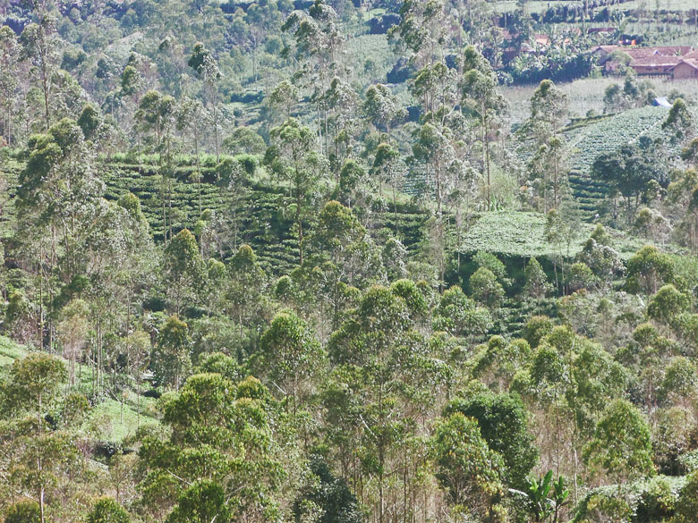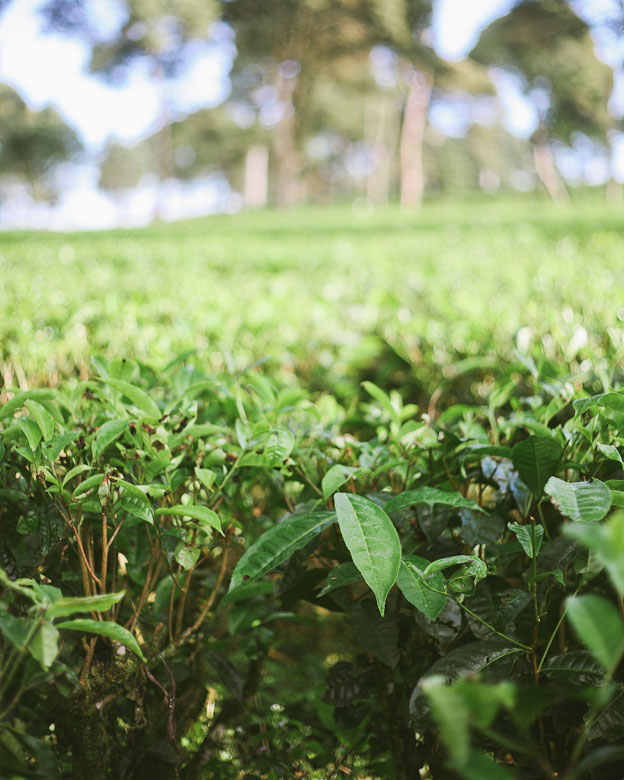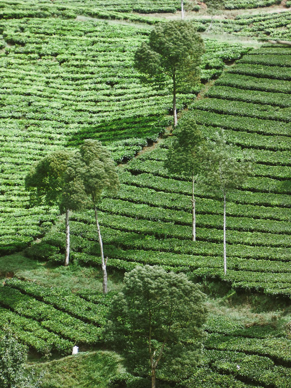 Hamparan daun yang luasnya tak terkira seperti permadani hijau diselingi kabut-kabut tipis seakan mengucap selamat pagi. Benar-benar luas, hingga sampai ke atas lereng bukit di kejauhan sana masih saja kebun teh. Pantas saja stok teh botol sos*ro tidak pernah habis. Kebun mereka saja seluas ini.