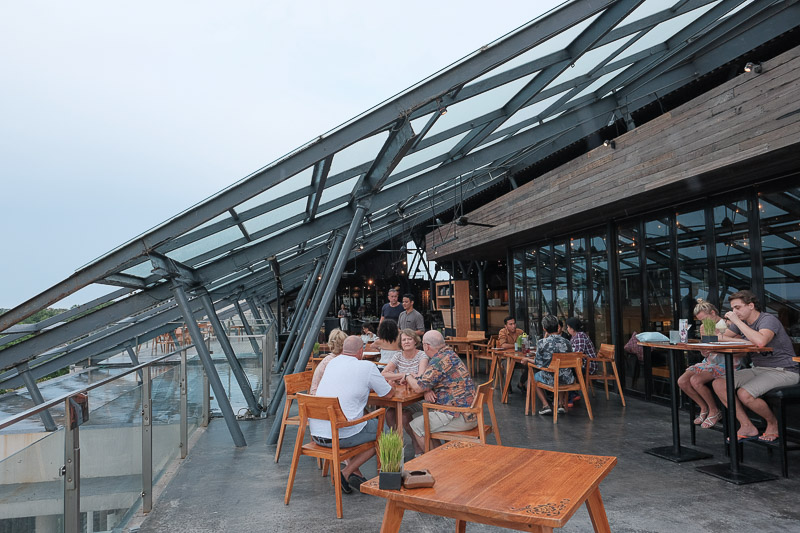 Letaknya persis di pinggir pantai seminyak, ada lift dari pinggir jalan langsung ke lantai lima tempat cafe ini berada. Atap cafe ini sangat instagram-able. Sayang sore itu hujan waktu saya disana.