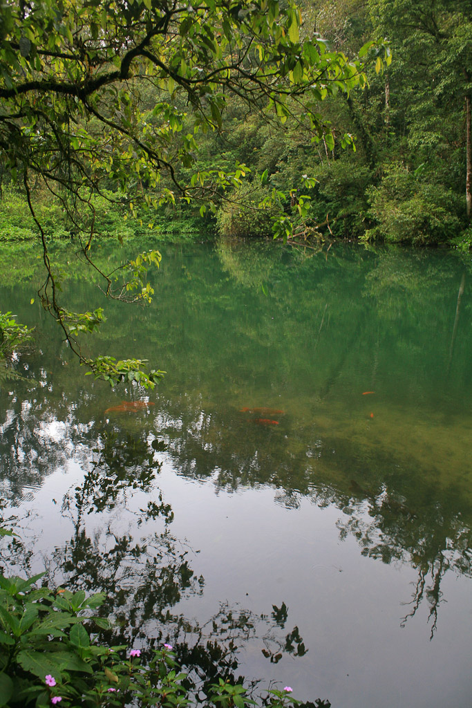 Ikan-ikan berukuran besar hidup di telaga biru, saya melihat ikan mas berukuran hingga 30-50 cm berenang dengan tenangnya disana. Sinar mentari menembus pepohonan yang rindang menambah irama dalam kesunyian telaga. Buat yang mencari ketenangan, tempat ini sangat saya rekomendasikan.