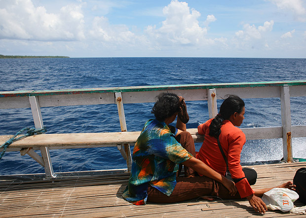 “Kaledupa-Kaledupa!” teriak awak kapal. Ternyata, kapal tidak bisa merapat karena air sedang surut. Terpaksa ina harus menggunakan “ojek” perahu kecil untuk mengantarkannya ke daratan Kaledupa. Ia naik ke kapal, sambil melambaikan tangannya ke saya.