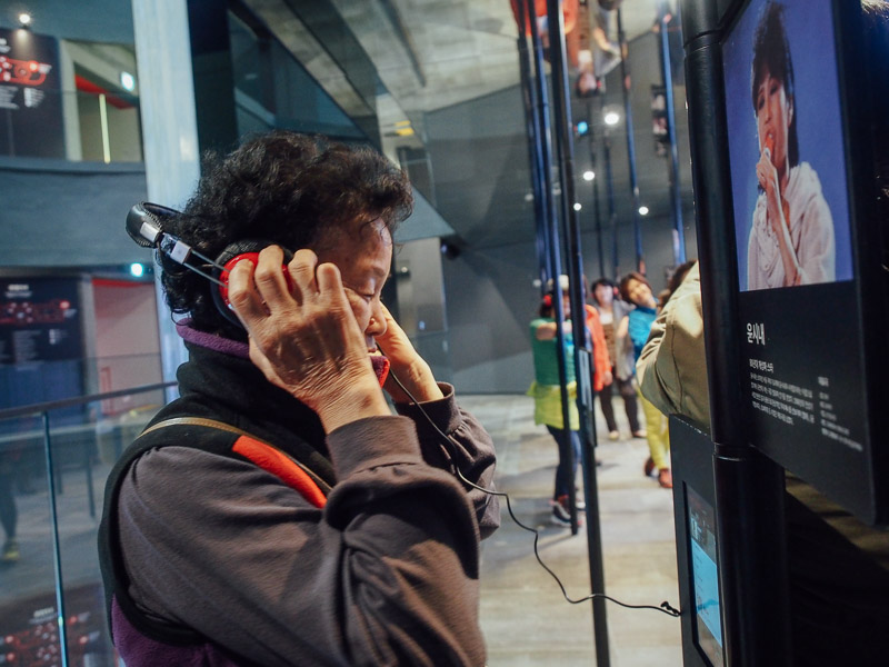 Seorang ahjumma mendengarkan lagu lawas di museum play kpop.
